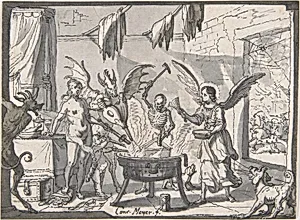 In the mid-to-late 17th, Swiss artist Conrad Meyer crafted *The Devil's Kitchen Visited by an Angel*, captivating ink drawing that blends the macabre with the divine. Measuring just 3 3/4 x 5 1/8 inches, this intimate work on paper—executed in pen and gray ink with brush and gray wash—emplifies the meticulous draftsmanship of Baroque-era Northern European artists. Meyer's style, rooted in the detailed, narrative-driven tradition of the time, often explored allegorical themes, making this piece a window into 17th-century moral and spiritual imagination. The title evokes a hellish scene: a "dev...