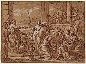 pen and brown ink with brush and brown wash, heightened with white gouache, over red chalk, on laid paper