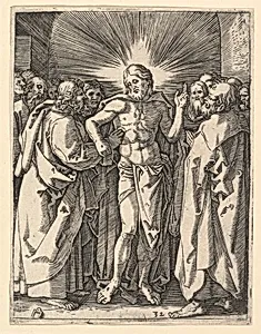 The Doubting Thomas; Christ among his disciples, Saint Thomas touching Christ's wound, after Dürer