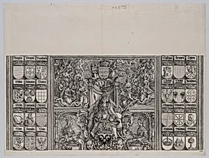 The Emperor Seated on His Throne, Seated Between Joanna of Castile and Mary of Burgundy, Above Are Twenty-two Winged Victories; with Coats of Arms of Maximilian's Noble Relatives, from the Arch of Honor, proof, dated 1515, printed 1517-18