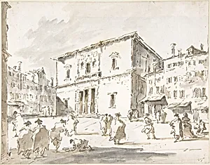 This exquisite double-sided drawing captures the grandeur of Venice's Teatro La Fenice on the recto, rendered by either Francesco Guardi (17121793) or his son Giacomo (1764–1835), masters of the Venetian veduta. Francesco, a leading figure in 18th-century Venetian art, specialized in luminous cityscapes blending precise architecture with atmospheric effects, while Giacomo continued this legacy. Here, the Fenice—Venice's premier opera house, inaugurated in 1792—emerges in intricate detail, complete with human figures animating the bustling square, evoking the city's vibrant theatrical life amid...