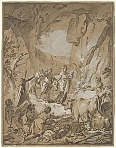 Pen and brown ink, brush and brown wash, heightened with white, on beige paper.