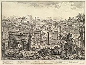 The Forum Romanum, or Campo Vaccino, from the Capitol, with the Arch of Septimius in the foreground left, Temple of Vespian right, and the Colosseum in the distance (Veduta di Campo Vaccino)
