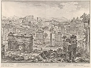 The Forum Romanum, or Campo Vaccino, from the capitol, with the Arch of Septimus Severus in the foreground left, Temple of Vespian right, and the Colosseum in the distance (Veduta di Campo Vaccino), from "Vedute di Roma"