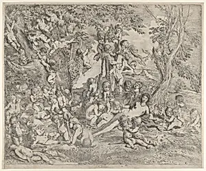 The Garden of Venus who reclines in the centre before a term of Pan and surrounded by cupids