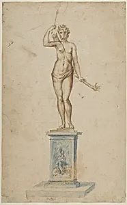 Pen and brown ink, brown and blue washes, red chalk, white gouache, over black chalk, squared in black chalk