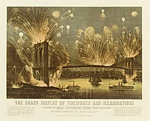 The Grand Display of Fireworks and Illuminations at the Opening of the Great Suspension Bridge between New York and Brooklyn on the Evening of May 24, 1883. View from New York Looking towards Brooklyn.