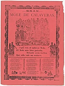 The grand skeleton mole, skeletons eating mole and drinking in a cemetery (Posada); flanked by skeletons holding scythes (Manilla)