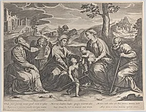 Behold *The Holy Family at right, with the infant Saint the Baptist, Elizabeth,arias, and an angel left*, a magnificent 17th-century engraving Flemish artist Pieter de Jode II after the renowned Venetian Renaissance master Titian (iziano Vecellio), with involvement from Anthony Bonenfant Created between 1631 and 1637, this large-scale print (15½ × 20 inches) captures a tender biblical scene: the Virgin Mary, Christ Child, and Joseph on the right, joined by the young Saint John the Baptist, his parents Elizabeth and Zacharias, and a graceful angel on the left. Such compositions were beloved in ...