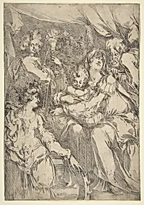 Jacques Bellange's *The Holy Family with Saint, Saint John the Evangelist and an Angel*c. 1612–16) is a masterful etching that captures a tender yet dramatic religious scene from the early Baroque era. The composition centers the Virgin Mary, Christ Child, and Saint Joseph surrounded by Saint Catherine—recognizable by her wheel—and Saint John the Evangelist, with an angel adding a touch of celestial grace. Created in the Duchy of Lorraine, where Bellange worked as a printmaker and painter, this print reflects the late Mannerist style prevalent in Northern Europe, characterized by elongated fig...