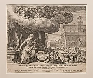 In 1589, Friedrich Sustris, Dutch-born painter and architect active at the Bavarian court, collaborated with the Flemish engraver Johann Sad I to create *The Holy Family with the Church of Saint Michael in under Construction*. This intricate engraving captures the Virgin Mary, infant Jesus, angels, and holy figures in a serene foreground, while the backdrop dramatically features the massive Jesuit Church of St. Michael—still under construction—in Munich. Commissioned during Duke Wilhelm V's reign, the church symbolized the Catholic Counter-Reformation's resurgence in Protestant-threatened Bava...