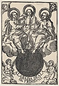 The Holy Trinity sitting on clouds surrounded by angels