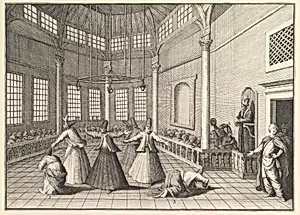 The Inside of a Mosque, the Dervishes Dancing (Aubry de La Mottraye's "Travels throughout Europe, Asia and into Part of Africa...," London, 1724, vol. I, pl. 16)
