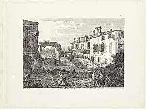 Welcome to *The Locks at Dolo*, a captivating etching by the masterful Venetian artist Canaletto (Giovanni Antonio Canal 1697–1768), created between 1735 and 1746. This detailed view captures an oval-shaped basin alive with boats at its center, flanked by sturdy buildings and lush trees. In the foreground, a fruit vendor hawks wares amid lively groups of figures—workers, travelers, and locals—evoking the bustling rhythm of daily life along the Brenta River near Venice. Part of Canaletto's renowned *Vedute* series ("Views," some taken from life, others imagined), it showcases his veduta style: ...
