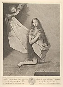 Behold *The Magdalene Kneeling*, a striking 18th-century print the *Recueil d'estamp d'après les plus célè tableaux de la Galerie Royale Dresde*, a celebrated series reproducing masterpieces from the Dresden Royal Gallery. between 1730 and 1786 by Venetian engraver Marco Alvise Pitteri and French etcher Pierre Hutin after Jusepe de Rib's dramatic Baroque painting—by the Spanish master known as "Lo Spletto"—it captures Mary Magdalene in a moment of profound devotion. Kneeling in contemplation, she is surrounded by angels and a coat of arms, evoking the intense spirituality and tenebrist shadows...