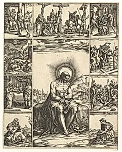 The Man of Sorrows; an image of Christ surrounded by nine vignettes depicting scenes of the Passion by Giorgio Ghisi