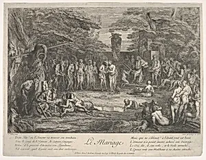 The Marriage (Le Mariage): in a forest, an old satyr marries the betrothed in center, musicians to right, old satyrs with canes to the left, a couple consulting an old philosopher to left in the foreground, from 'The lives of satyrs' (La vie des satyres)