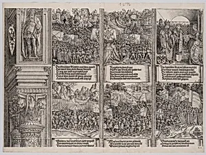 The Marriage of Philip the Fair to Joanna of Austria; Maximilian Recaptures the Occupied Territories from Hungary; The Conquest of Hungary; The Swiss War; The Liberation of Naples; and The Battle of Wenzenberg, from the Arch of Honor, proof, dated 1515, printed 1517-18