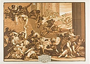 Chiaroscuro woodcut in buff, violet-gray, light brown and dark violet-brown on off-white laid paper
