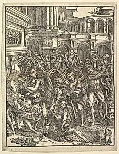 Domenico Campagnola's *The Massacre of the Innocents (Right side)*, in 1517, a harrowing moment from the New Testament: King Herod's soldiers slaughtering infant boys in a futile attempt to eliminate the infant Jesus. This woodcut, the right panel of a larger composition, depicts a chaotic group of muscular male figures—many nude—brutally attacking desperate women and children amid grand classical buildings in the background. The Venetian artist's dramatic rendering evokes the Renaissance fascination with biblical narratives and antiquity, blending intense emotion with architectural grandeur. ...
