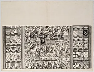 Behold *The Middle Portion of the of Maximilian*, a striking woodcut and letterpress print from 1515 (proof printed 1517–18), crafted by Hieronymus Andreae and Hansinklee. This monumental sheet, measuring nearly 2 by 2 feet, forms part of the emperor's grand *Arch of Honor*—a colossal propagandistic print project designed by Albrecht Dür and his circle to celebrate Holy Roman Emperor Maximilian I's illustrious lineage. Commissioned as a paper triumph, the full *Arch* could expand to over 10 feet tall when assembled from dozens of blocks, rivaling stone arches in imperial Rome. This central ge...