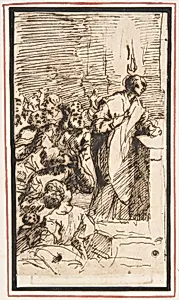 Giovanni Lanfranco (1582–1647), a leading Italian Baroque artist trained under the Carracci brothers, masterfully captured dynamic religious drama in this pen and brown ink drawing. Titled *The Miraculous Mass Saint Martin of Tours with Apparition of a Ball Fire above His Head*, depicts the 4th-century saint during a Eucharistic celebration, where a divine fireball hovers overhead—a miracle symbolizing heavenly approval. The intimate sheet (7 3/16 x 4 1/8 in.) teems with a crowded scene of human figures, showcasing Lanfranco's skill in rendering energetic movement and emotional intensity. As ...