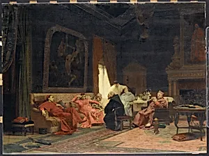 Jean-Georges Vibert's *The Missionary's Adventures* (ca. 1883) captures a whimsical moment in an opulent interior, blending humor with meticulous detail in oil on wood. This painter, renowned for his genre scenes of clergy, often infused academic realism with satire, poking gentle fun at ecclesiastical life. The large-scale work (39 x 53 in.) showcases Vibert's mastery of light and texture on the smooth wood panel—a medium evoking Old Master traditions while suiting his precise brushwork. At the heart of the painting are figures like bishops and monks, accompanied by dogs, suggesting a lively...