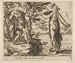 Dirck Volckert Coornhert's *The One to Whom Fortune Playing Will Dance Merrily is a captivating engraving from around 1560, part of his series *Six Sayings about Fortune This Dutch artist and humanist thinker, active in the vibrant Antwerp printmaking scene, used engravings to explore moral and philosophical themes, drawing from Renaissance emblem traditions. The plate measures 8 1/8 9 11/16 inches, with a larger size that highlights the precision of 16th-century print techniques, allowing for detailed dissemination of ideas across Europe. The title evokes a lively allegorical scene where For...