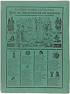 The pantheon of all the skeletons who are eating and drinking in a cemetery (Posada); flanked by skeletons holding scythes (Manilla)