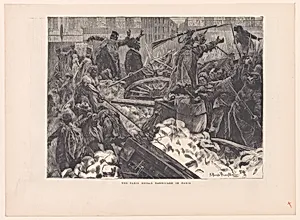 In the turbulent spring of 1871, during the Paris Commune—a radical socialist uprising against the French government—Arthur Boyd Houghton captured a dramatic moment of urban rebellion in *The Paris Mob–Aricade in Paris*. in the British illustrated weekly *The Graphic* on April 8, this wood engraving vividly depicts revolutionaries, including men and women, fortifying a barricade amid the chaos of Paris streets. Houghton's image, measuring nearly 9 by 12 inches, brought the distant conflict into British homes, fueling public fascination with the Commune's dramatic rise and fall, which ended in ...