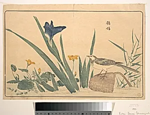 **The Pied Wagtail**, created by Japanese artist Kuwagata Keis in 1789, the delicate charm of nature through a vibrant woodblock print in ink and color on paper. 10 x 14 7/8 inches, this intimate work from Japan's Edo period (16151868) features a wagtail—a small, lively bird known for its distinctive black-and-white plumage and bobbing tail—amidst blooming flowers and lush leaves. The tags highlight these motifs, evoking the seasonal beauty central to Japanese aesthetics. Woodblock printing, a hallmark of Edo-era art, allowed for mass production of affordable, colorful images that brought art...