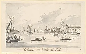 Giacomo Guardi, son of the renowned Venetian vedutista Francesco, captures the bustling Porto di Lido in this delicate drawing from around 1804–28. The Lido inlet, Venice's vital gateway to the Adriatic Sea features prominently, with the imposing Fortezza Sant'Andrea—a 16th-century Venetian stronghold—rising on the left. Ships and boats dot the waterway, evoking the lagoon city's enduring maritime pulse during a time of political flux after Napoleon's conquest of Venice in 1797. Executed in pen and brown ink with gray wash on a modest 4 13/16 x 8 3/8-inch sheet, this work exemplifies the Guar...
