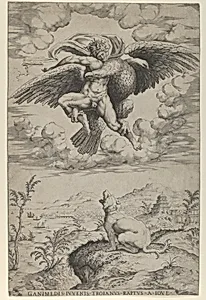 In the grand tradition of Renaissance mythology, *The Rape of Ganym* captures a dramatic moment from Ovid's *Metamorphoses*: the Trojan shepherd boy Ganymede, seized by Jupiter (Zeus) disguised as an eagle, is whisked to the heavens to serve as the gods' cupbearer. Below, his loyal dog barks in futile protest, adding pathos to the scene. Designed by Michelangelo Buonarroti around 1542 and masterfully engraved by Nicolas Beatriz, this print exemplifies the High Renaissance master's fascination with dynamic male nudes and anatomical perfection, bridging his sculptural prowess with the printed me...