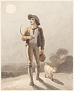 Behold *The Reaper (The Harvest Moon)*, a delicate drawing by British artist Richard Westall, between 1751 and 1775. This intimate work, measuring just 10.2 x .2 cm, captures the timeless rhythm of rural life under a glowing harvest moon. Westall, known for his evocative illustrations and history paintings, here evokes the poetry of the English countryside, blending human labor with the grandeur of nature. Executed in pen and gray ink with gray wash and watercolor over graphite wove paper—a smooth, innovative support that emerged in the 18th century—this piece showcases Westall's masterful co...