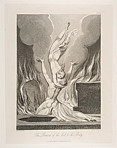 **The Reunion of the Soul & the Body** is a striking engraving from the illustrated edition of Robert Blair's 1743 poem *The Grave*, a meditative reflection on mortality and the afterlife. This poignant plate, dated March 1, 1813, captures a visionary moment of resurrection, where ethereal souls reunite with their earthly bodies amid dramatic, swirling forms. Published by Rudolph Ackermann in London, draws visitors into the Romantic fascination with death, redemption, and the divine spark within humanity. William Blake, the visionary poet and artist, created the original designs, infusing the...