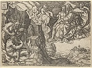In Heinrich Aldegrever's 1554 engraving *The Rich Man in Hell Seeing Lazarus Embraced by Abraham*, visitors witness a vivid depiction from the New Testament parable in Luke 16. The scene contrasts the torment of the wealthy man amid demons in the fiery pits of Hell with the comforting embrace of the poor beggar Lazarus by the patriarch Abraham in paradise. This moral tale warns of divine judgment, emphasizing charity and humility—timely themes during the Protestant Reformation, when such imagery reinforced ethical teachings across Europe. Aldegrever, a masterful German engraver of the Norther...