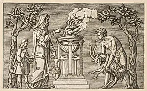 The Sacrifice of a Ram; naked man at right guiding a ram towards an altar pyre, hooded priest at left with a young attendant