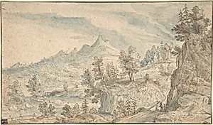 Pen and gray ink, brush and brown wash and blue watercolor; framing line in brown ink