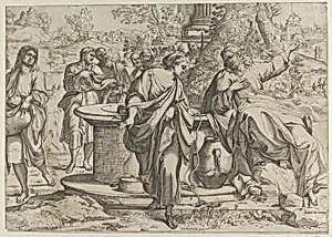The Samaritan woman standing at the well, Christ seated next to her pointing to the right, after Annibale Caracci