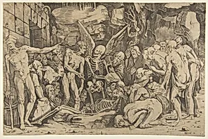 The Skeletons, a group of emaciated men and women gathered around a skeleton laid on the ground and a figure of Death as a winged skeleton standing above it holding an open book