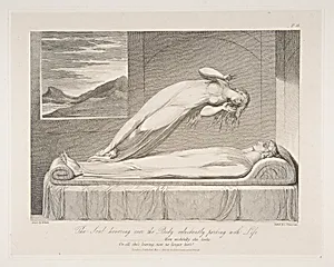 In the early 19th century, Blake, the visionary Romantic artist and poet, designed a series of haunting illustrations for Robert Blair's1743 poem *The Grave*, a meditation on mortality and the afterlife This engraving, titled *The Soul Hovering over Body, Reluctantlying with Life*, captures poignant moment from that work. on March 1, 1813, by Rudolph Ackermann in London, was masterfully engraved by Luigi Schiavonetti, delicate line work brought Blake's ethereal visions to life on a modest plate measuring 6 3/8 x 8 15/16 inches. The image depicts a female soul, luminous and sorrowful, floating...
