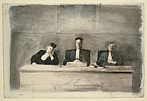 Honoré Daumier, a master of 19th-century French caricature and social commentary, created *The Three Judges* around 1858–60. This watercolor and gouache work on ivory laid paper captures his signature satirical bite, skewering the pompous French judiciary during the Second Empire under Napoleon III. Daumier, who produced over 4,000 lithographs critiquing corruption and inequality, often targeted lawyers and judges, portraying them as grotesque figures more interested in self-importance than justice. Rendered in a dynamic mix of watercolor, black and gray gouache, charcoal, and graphite, the 3...