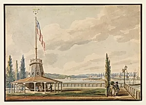 Imagine arriving in New York Harbor around 1811, your first glimpse of America's bustling young republic unfolding before you. That's the magic captured in *The Traveler's First View of York—The Battery and Flag* by Pavel Petrovich Sin, a Russian diplomat artist who visited the United States from 1811 to 1813. This intimate watercolor and ink on paper (6 3/16 x 8 7/8 in.) depicts the Battery, Manhattan's southern tip—a former fortification turned promenade—with its prominent flagstaff symbolizing national pride amid ships and cityscape. Created during a pivotal era when New York was emerging ...