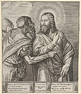 The Tribute Money: two Pharisees, one holding out a coin in his right hand, approach Christ from the left