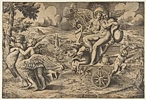 The triumph of Cupid and Psyche who are seated on a chariot drawn by two birds restrained by children