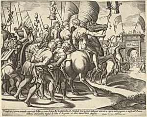 The Triumph of Scipio who rides on a horse followed by captured slaves