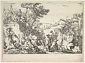 Jean-Baptiste Marie Pierre's *The Village Festival (ête de village dans la romaine)*, created around 1735–40, the joyful spirit of rural life in the Roman countryside. This lively etching depicts a festive gathering with men and women dancing amid houses, trees, and musicians playing instruments, evoking the Rococo era's delight in everyday pleasures and harmonious landscapes. Pierre, a prominent French painter and engraver who later directed the Académie de France in Rome, drew inspiration from such idyllic scenes, blending elegance with rustic charm. As an etching in proof state—an early im...
