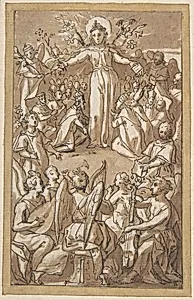 In the late 16th to mid-17th century Flemish artist Pieter de Jode I this intricate drawing, *The Virgin Surrounded by Angels and Representatives of Secular and Ecclesiastical*. Executed in pen and brown ink with brush and brown wash, small sheet (just under 5 by 3 inches) captures a heavenly assembly around the Virgin Mary. Angels, some bearing musical instruments, flank her alongside figures symbolizing church and state leaders, evoking the Counter-Reformation era's emphasis on Marian devotion and the harmony of divine and earthly authority in Catholic Flanders. De Jode, a skilled engraver ...