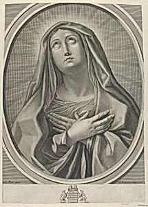 In the serene engraving *The Virgin with Arms Crossed over Her Chest, Looking Up the Left, in an Oval Frame, after Reni* (1640–45), French engraver Gilles Rousseletfully reproduces a devotional image originally painted by the acclaimed Italian Baroque artist Guido Reni. Reni, a leading figure of the Bolognese school, was renowned for his graceful, idealized religious figures that blended classical elegance with emotional piety. Here, the Virgin Mary gazes heavenward in quiet contemplation, her crossed arms symbolizing humility and prayer—a motif evoking Counter-Reformation devotion during a ti...