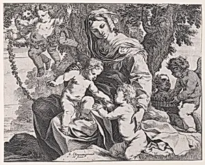 In the heart of 17th-century France, during the Baroque era's flourish of dramatic religious imagery, François Chauveau crafted *The Virgin with Christ Child Saint John the Baptist* 1630–68. Chauveau, a master engraver and illustrator (0–1676), was renowned for his intricate reproductive prints that brought grand paintings to wider audiences through books and portfolios. This etching tenderly depicts the Madonna cradling the infant Jesus, with the young Saint John the Baptist nearby—a classic devotional motif echoing earlier Renaissance masters like Raphael, symbolizing purity, prophecy, and d...
